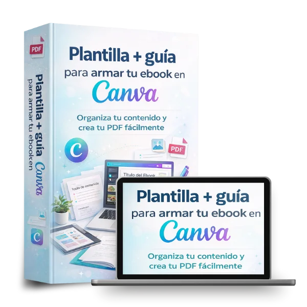 Incluye una plantilla editable en Canva + una guía práctica, para ayudarte a ordenar tu contenido y convertirlo en un ebook en PDF limpio y presentable, incluso si nunca has diseñado uno antes.